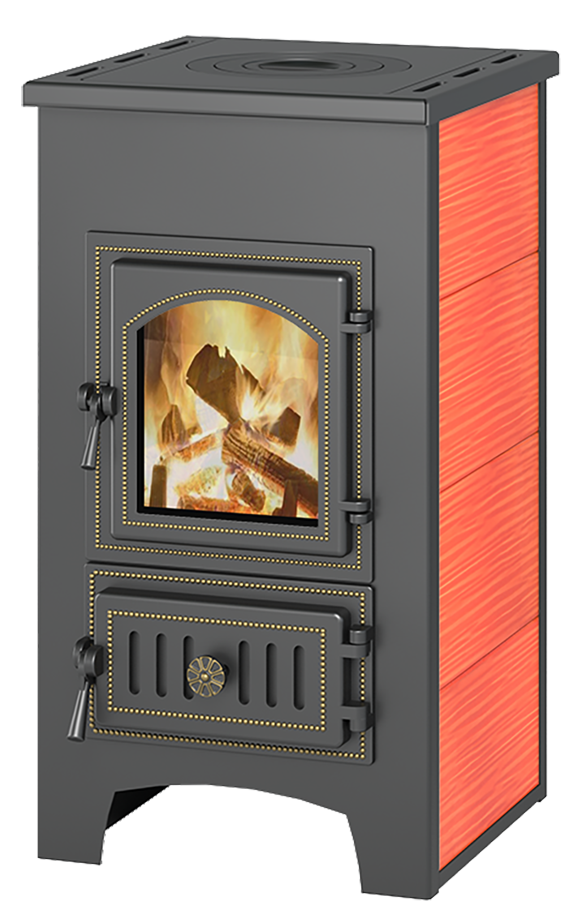 Печь-камин Везувий ПК-01 (270) красный с плитой - предназначен для отопления домов, дач, садовых домиков, общим объемом отапливаемых помещений до 150 м.куб.. Это компактный, функциональный, простой в эксплуатации камин. Топка камина выполненная из особо прочной котловой стали 09Г2С толщиной от 3,0 мм, а отбойник пламени выполнен из 2 мм нержавеющей стали. Дверца печи чугунная со стеклом, организован вторичный дожаг газов для повышения КПД печи. Внутренная отделка топки шамотом, что обеспечивает долговечность, а наружная отделка керамической плиткой для обеспечения уюта в доме с установленной печью-камином. Варочная плита добавляет функциональности в дачных условиях. Для динамичного нагрева помещения возможна установка принудительного обдува (вентилятора, который покупается отдельно).