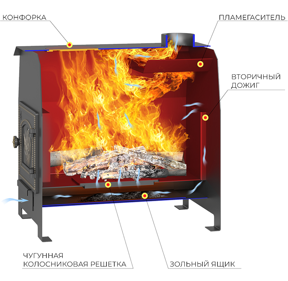 - чугунная дверца и усиление конвекции за счет установленных на боковых поверхностях желобов;