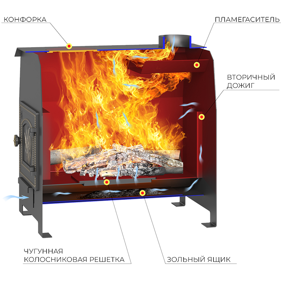 - чугунная дверца со стеклом и усиление конвекции за счет установленных на боковых поверхностях желобов;