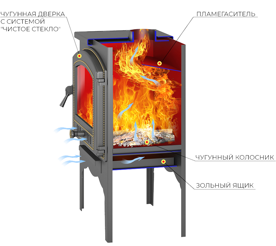 | Направление открывания дверцы топки: | Правостороннее (на себя и направо) |