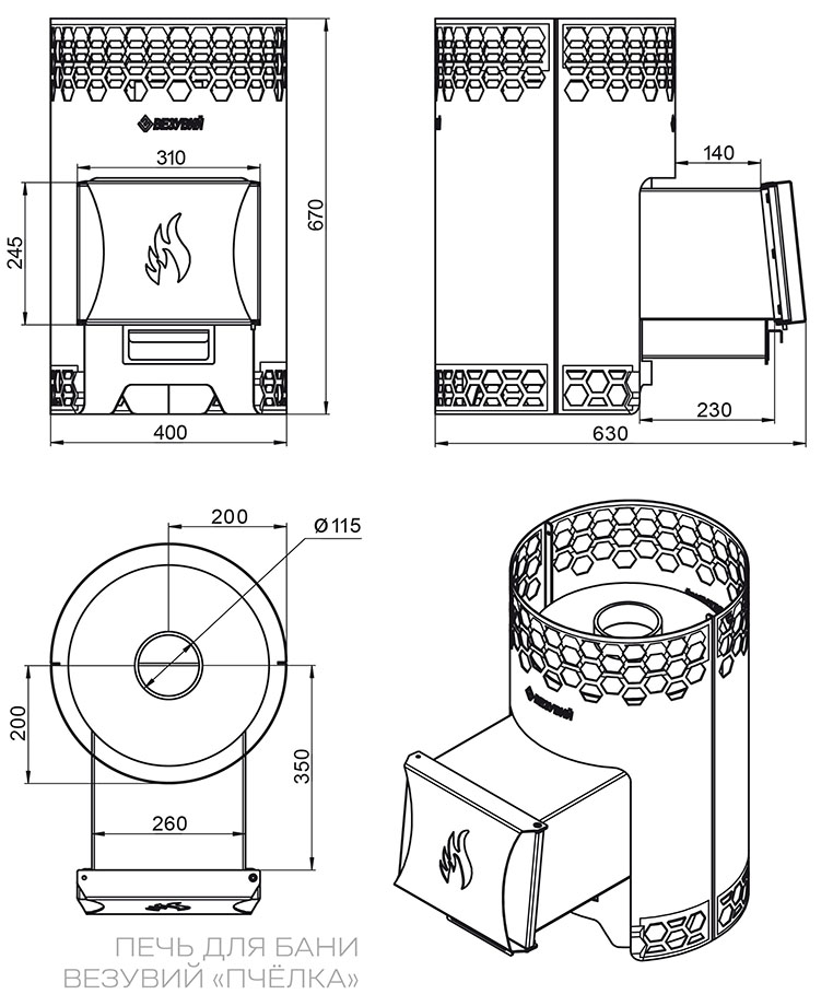 Монтажные размеры печи Везувий Пчелка