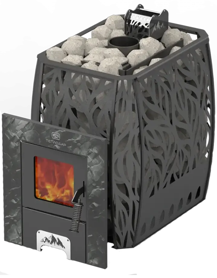 Печь для бани Теплодар Скала 12 Т стекло - печь рассчитана на нагрев парного помещения бани объемом до 12 м.куб. Протапливается печь из соседнего с парной помещения бани (выносная топка). Топка печи изготовлена из 6 мм конструкционной стали, колосник из чугуна. Топка печи снаружи охвачена сеткой в форме бочки и для обклада камнем. Наличие закрытой каменки с распределителем воды дает возможность поэкспериментировать с микроклиматом в парном помещении бани поливая на разные камни (открытой и закрытой каменок). Для нагрева воды нужно использовать бак на трубе или выносной бак с нагревом через теплообменник. У печи есть стекло в дверце для контроля за горением дров.