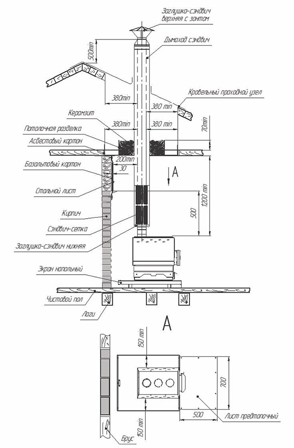 - при установке на деревянный пол положить на него кирпичную кладку в 1/4 кирпича,